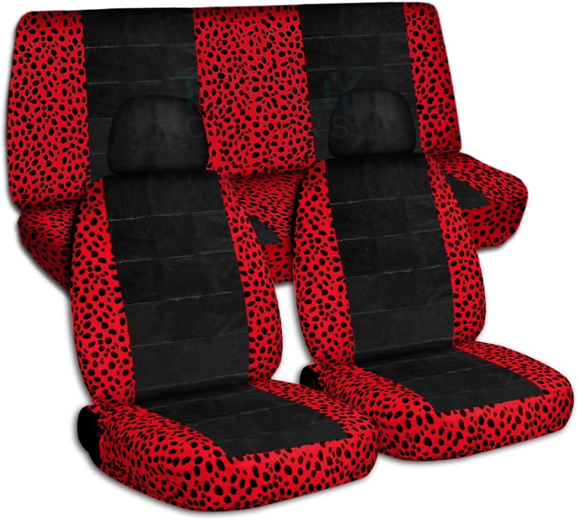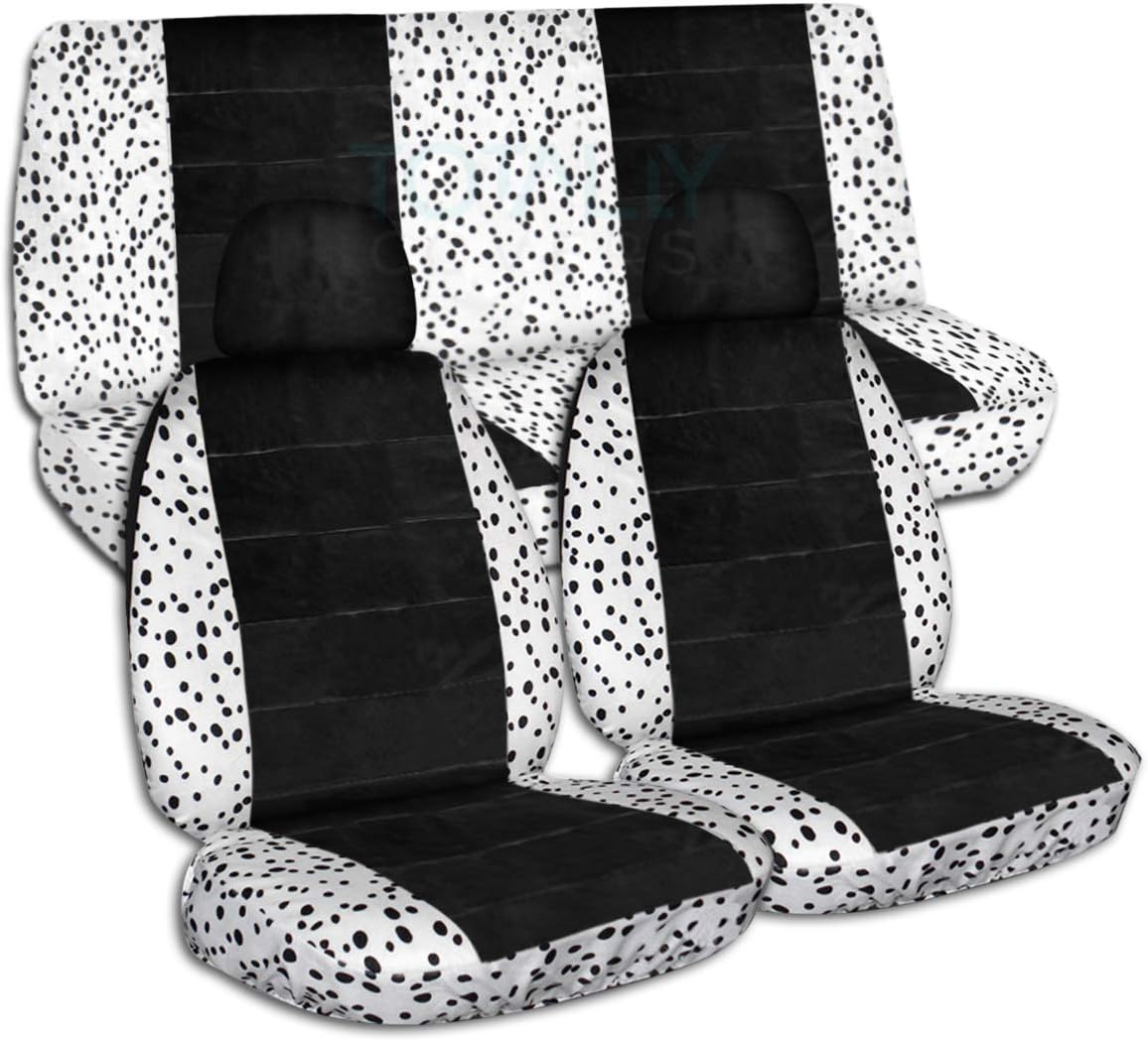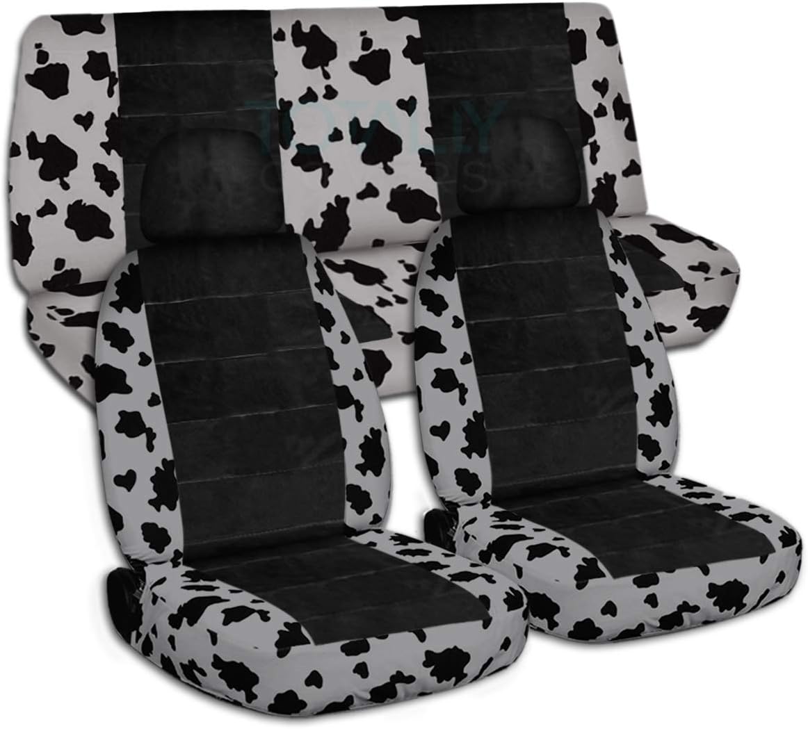 A full set of front and rear, pink-black cow and black car seat covers with 2 front separate headrest covers. Be sure to visit our storefront ("Totally Covers") where you can find the largest selection of seat covers, to satisfy even the most demanding of tastes. If you can't find what you are looking for, please contact us ("Totally Covers") We can make seat covers for ANY car, truck, van, RV or SUV in a variety of 145 colors and prints, and even add your name/text and logo/design on them!